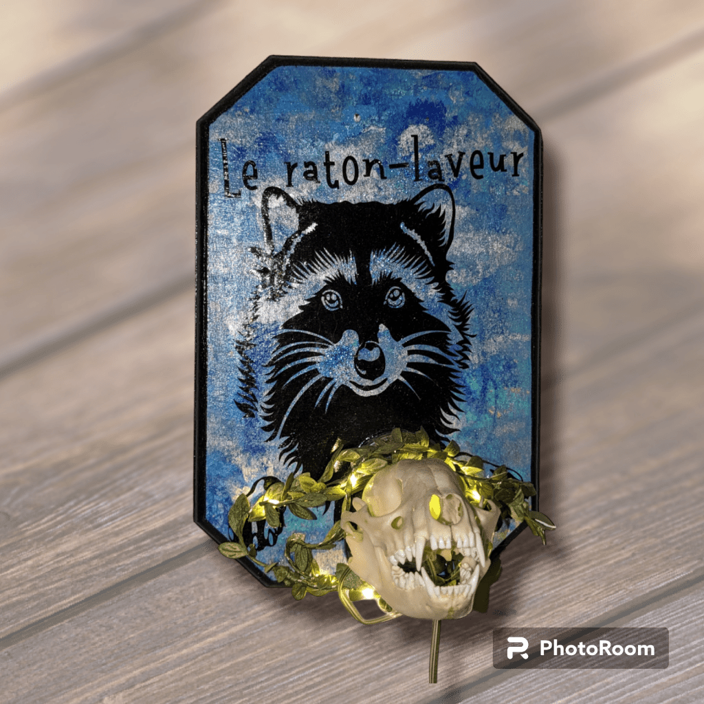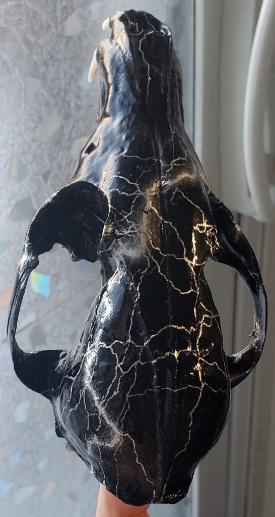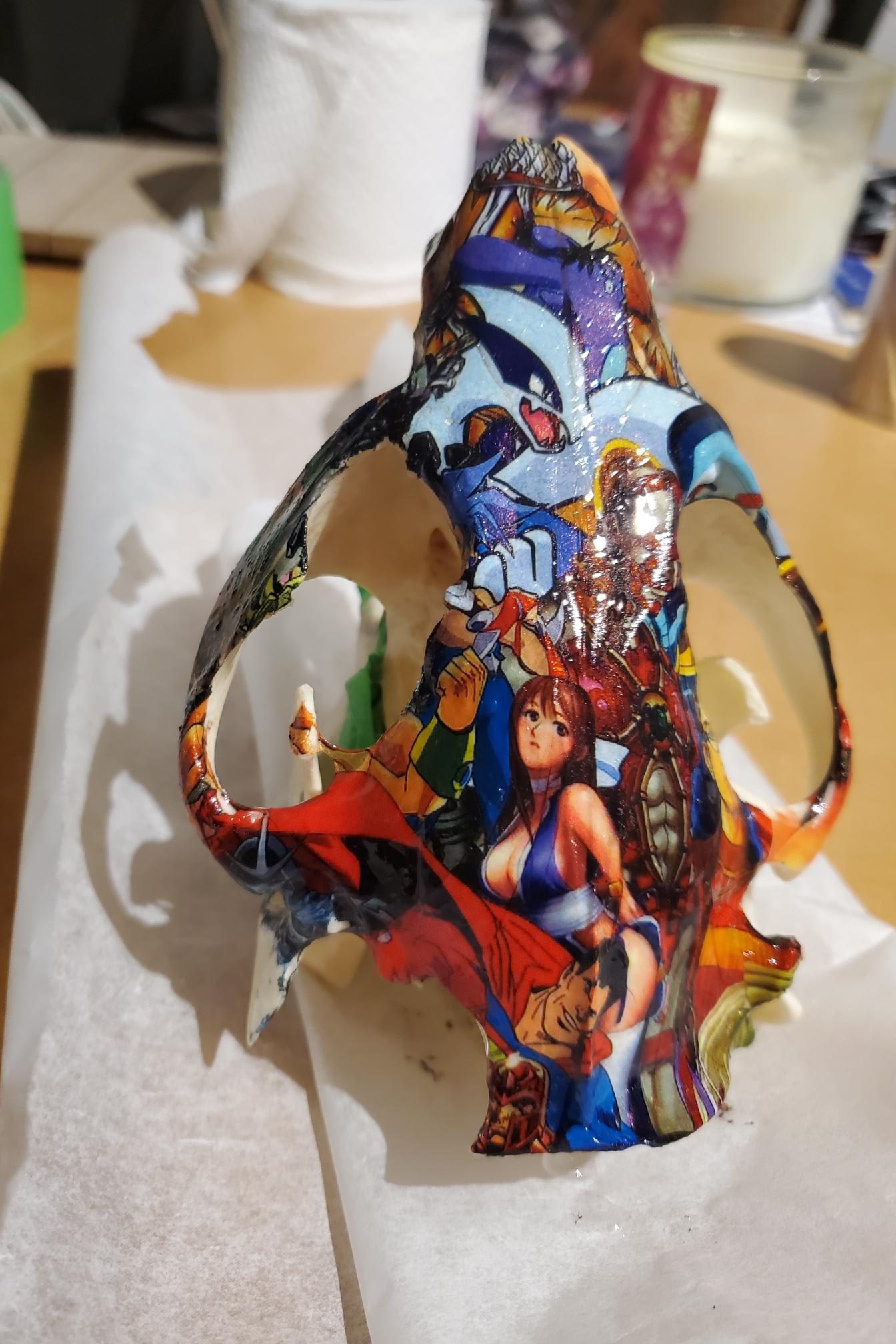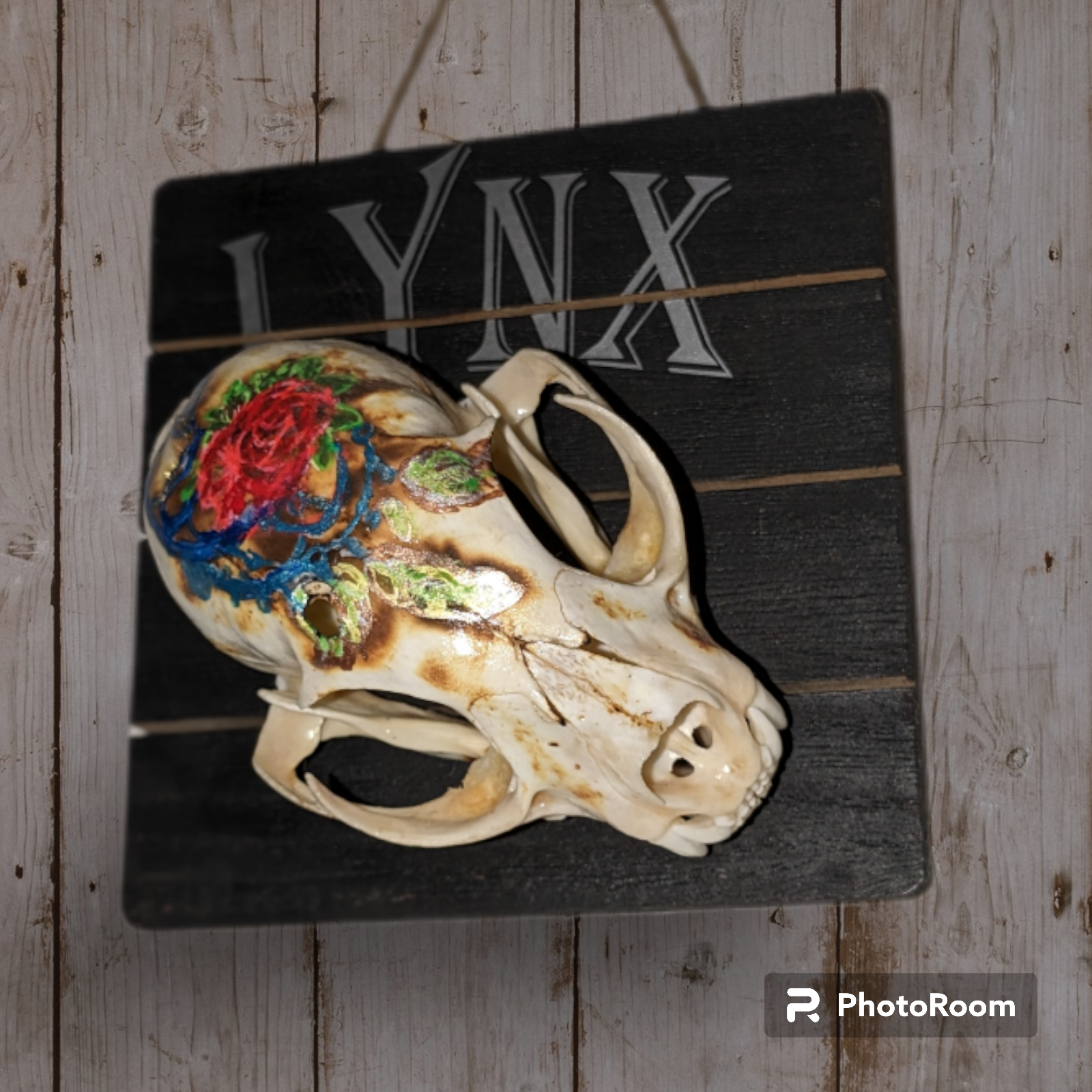 Véritable crâne de Lynx blanchis et peinturé à la main sur cadre décoratif