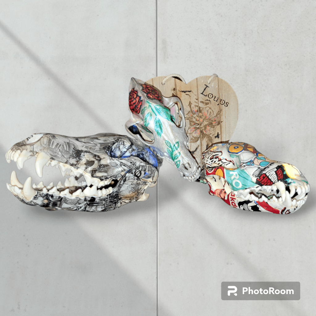 Véritables crânes de Loups gris blanchis et peinturés (prix/unité)